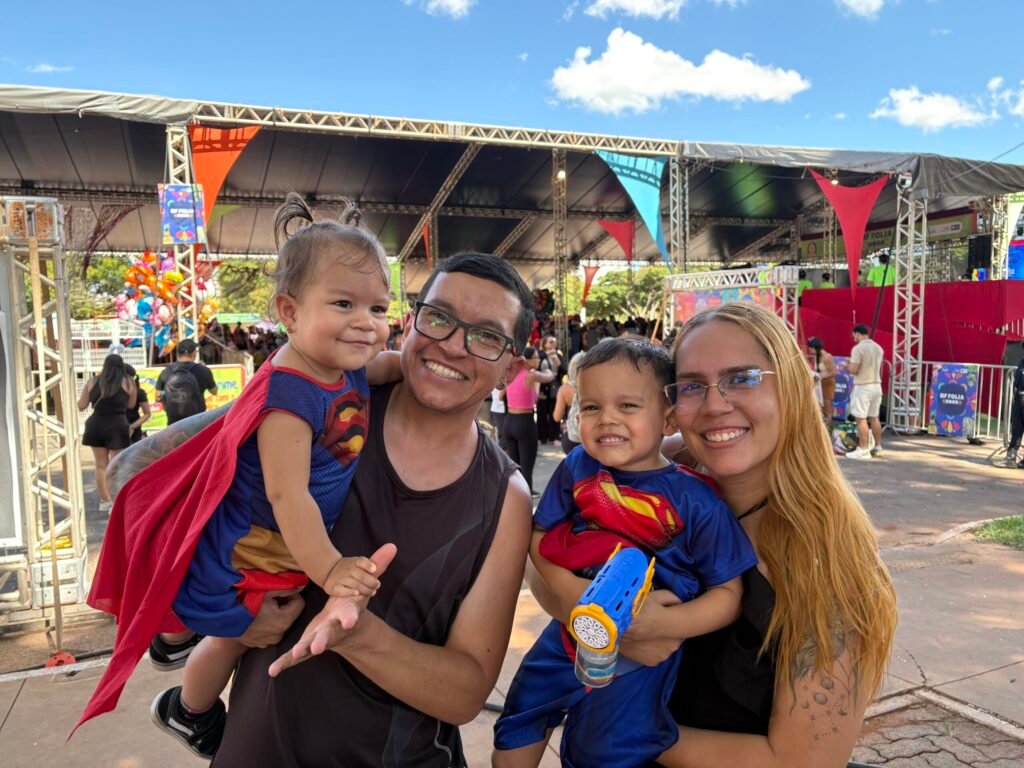 Ariadna Sarti, 27 anos, técnica de enfermagem, compareceu à folia com o marido João Paulo da Silva, empreendedor de 34 anos, para levar a filha de um ano, Maria Julia, e o filho mais velho, João Gabriel, de três anos. A família mora em Brasília e busca anualmente o bloco para garantir a diversão dos pequenos.